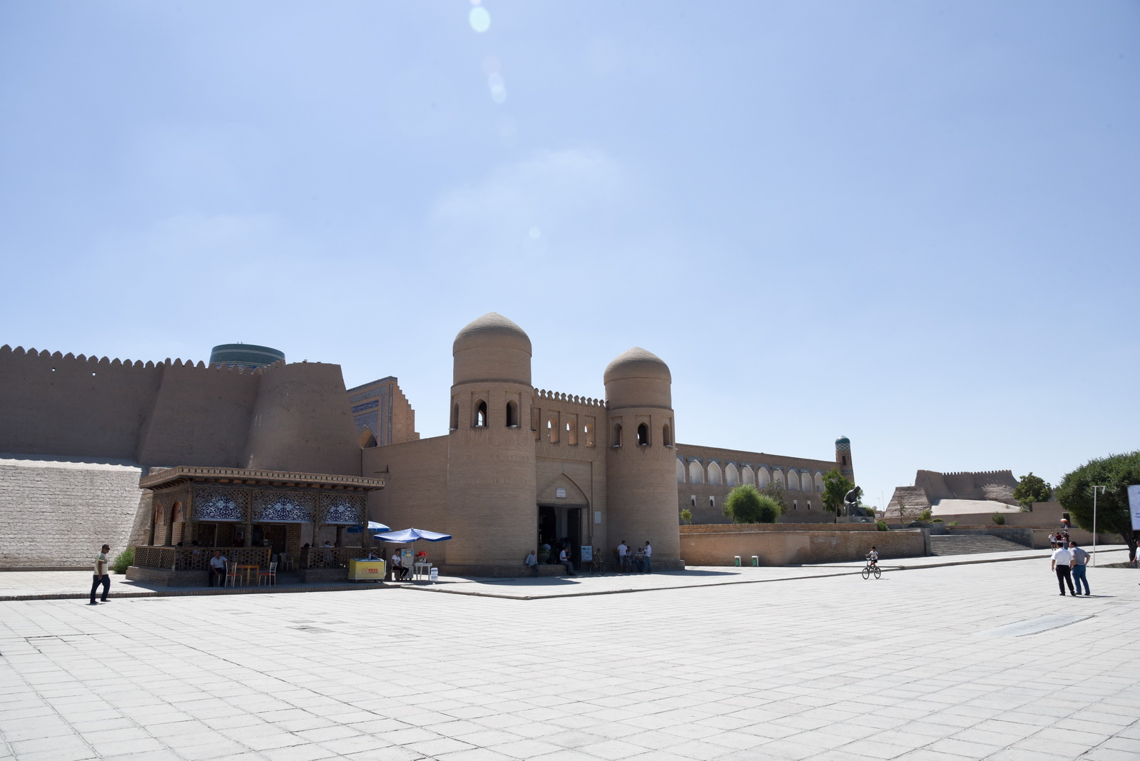 서문으로 입장하면서 오른쪽으로 보이는 Orient Star Khiva. 마드라사로서 이슬람의 고등교육 기관이었지만 지금은 호텔로 이용되고 있다. Kalta Minor Minaret이 옆에 있다.