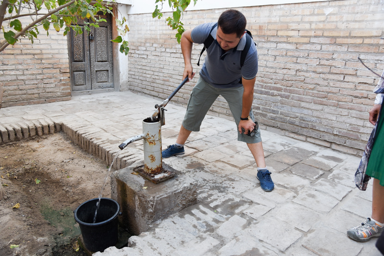 옛날에 사용하던 우물이라고 하여 물을 퍼올려보는 여행객과 베흐조드 아저씨.