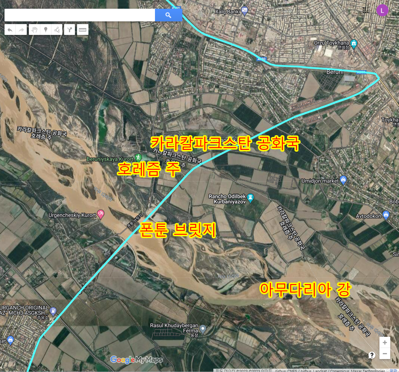 폰툰 다리가 카라칼팍스탄과 우즈벡의 호레즘 주의 경계가 되겠다.