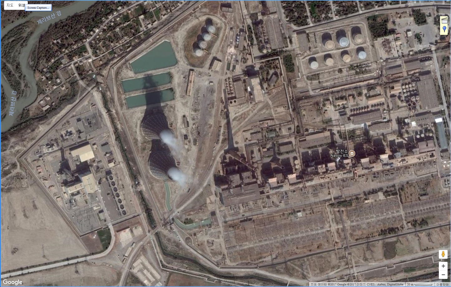 하늘에서 보면 이렇게 보인다~ 나보이 시의 제라프샨 강가에 위치하고 있다. 냉각탑 두 개.