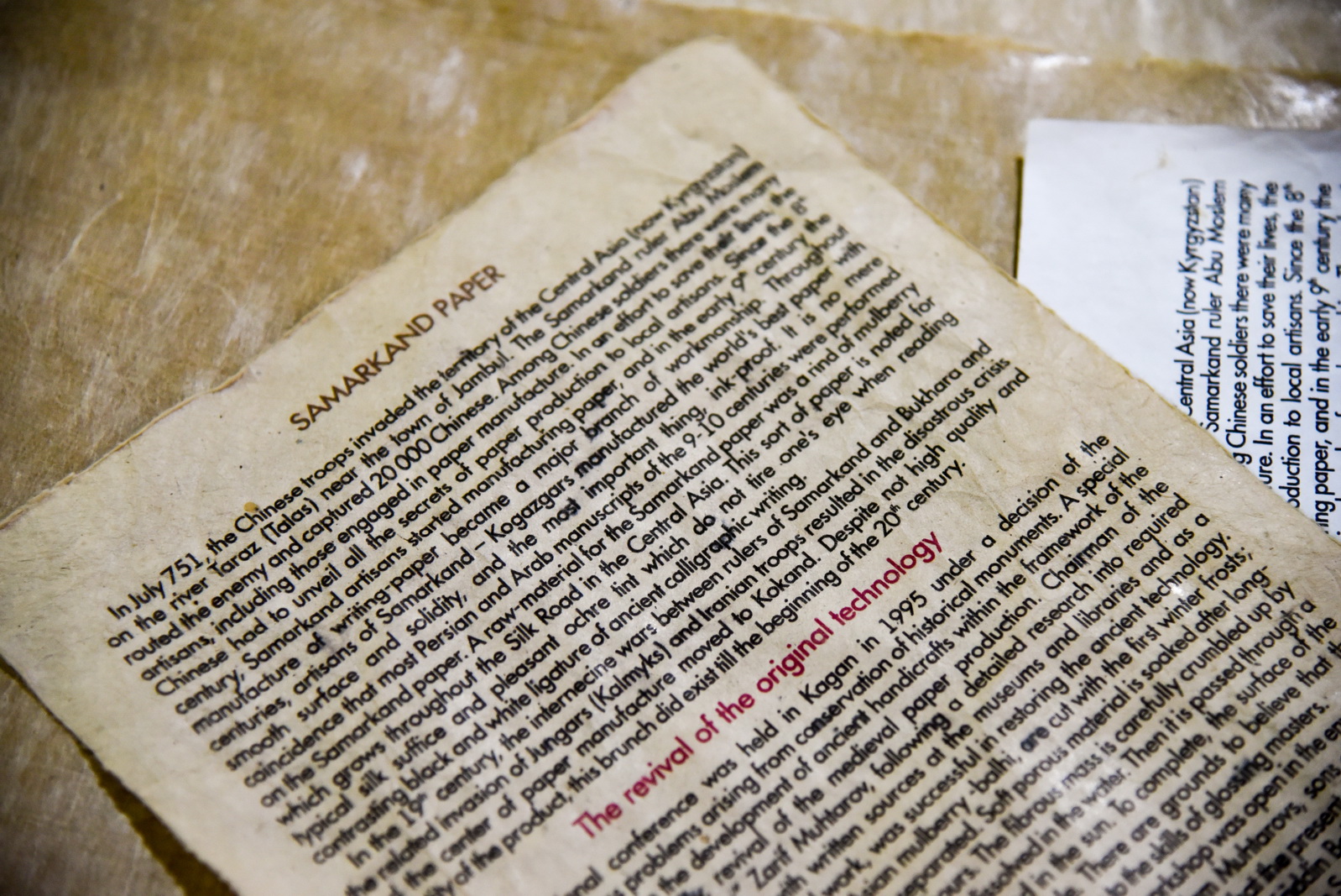 사마르칸트 종이는 고선지 장군의 군대를 통해 전래된 것이라고 한다. 품질이 좋아 성업하였으나 18세기에 그 맥이 끊겼었던 것을 재연한 것이다.