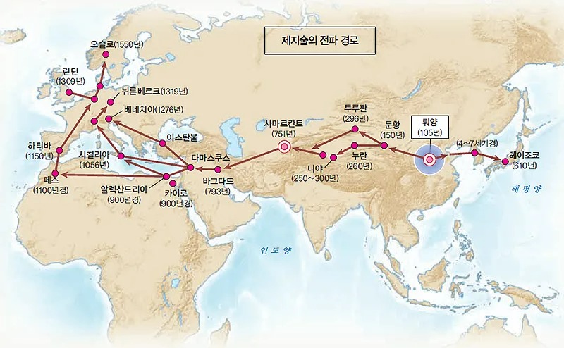 중국에서 시작된 종이 제조 기술이 이렇게 세계로 퍼졌다고 한다.