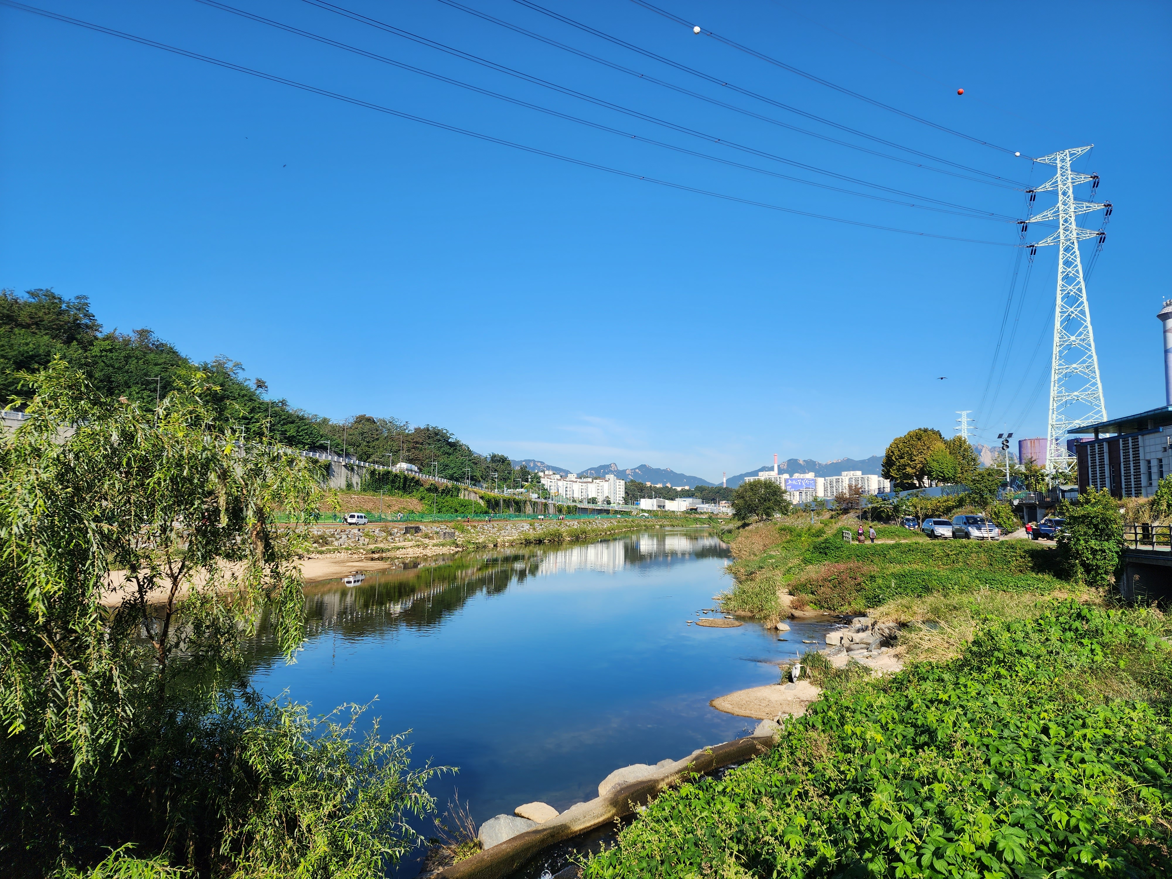 당현천과 중랑천의 합류 지점에 도착했다. 중랑천도 하늘도 파릇파릇하다. 실제로 이렇게 파랗게 보이지는 않는데, 스마트폰 카메라에 찍한 하늘과 하천이 이렇다. DSLR 카메라로 찍은 사진보다 스마트폰 카메라의 사진은 유독 파랗다. CCD에 무슨 차이가 있는 것인지 궁금하다.